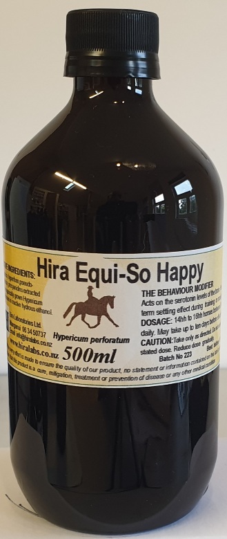 An amber bottle contains 500ml of St John's Wort extractHira Equi-So Happy ( Hypericum Perforatum )