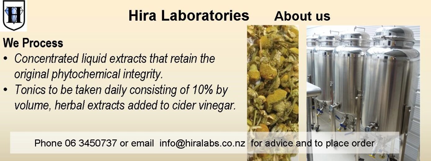 Hira Laboratories was established as a limited company in 1999 after many years of preparatory research. Its objective is to provide a range of herbal plant based products for people and animals organically grown and manufactured in New Zealand. The company has been involved in developing a medicinal plant nursery focusing on the more unusual ones like ashwagandha, as well as one additional very precious plant involved in addressing the insulin response.