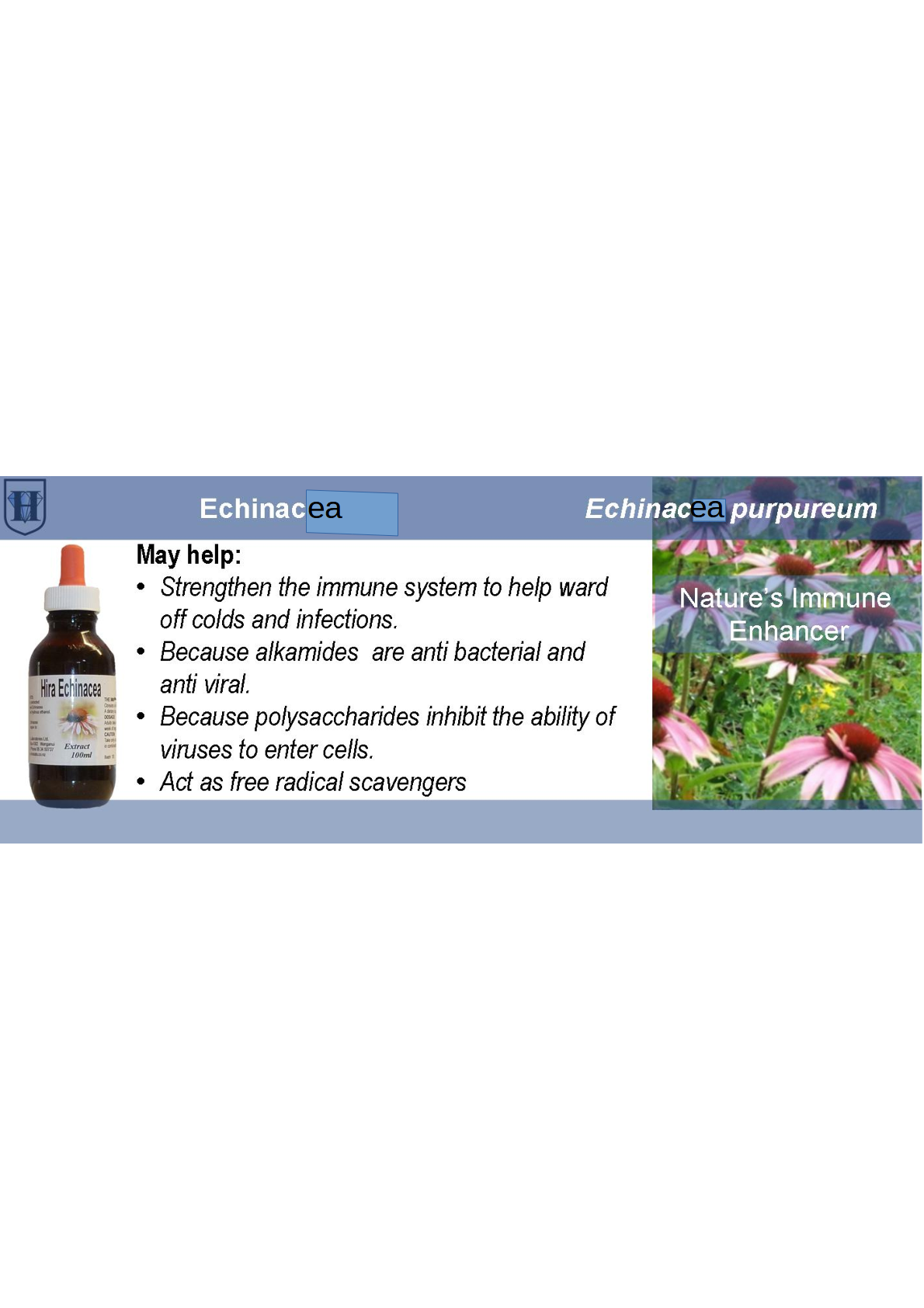 Stimulates the immune system. Increases the body’s ability to fight infection. Increases white and red cell production.  Echinacea purpurea