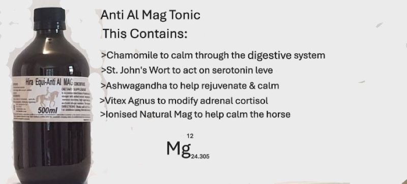 The product contains natural plant based ionised magnesium and will help counteract the effects of ‘hot pastures’ and feed. The combination of active plant ingredients in cider vinegar ( alkalinises the blood) this easily absorbed magnesium together with plant sedatives like chamomile, scullcap, vitex agnes and passionflower help calm your horse during times of excessive reactivity. The bitter detox herbs act on the liver to help flush myco-toxins. Brewers yeast is also an inexpensive ‘toxin binder’ 1-2 tablespoons daily.To further enhance the calming effect add an additional capful (20ml) to the feed in doing so you will be giving more ‘calming’ herbs. Contact us directly at info@hiralabs.co.nz for information of the role of magnesium and how stress and a high cortisol set-point will cause the horse to excrete this essential mineral.
