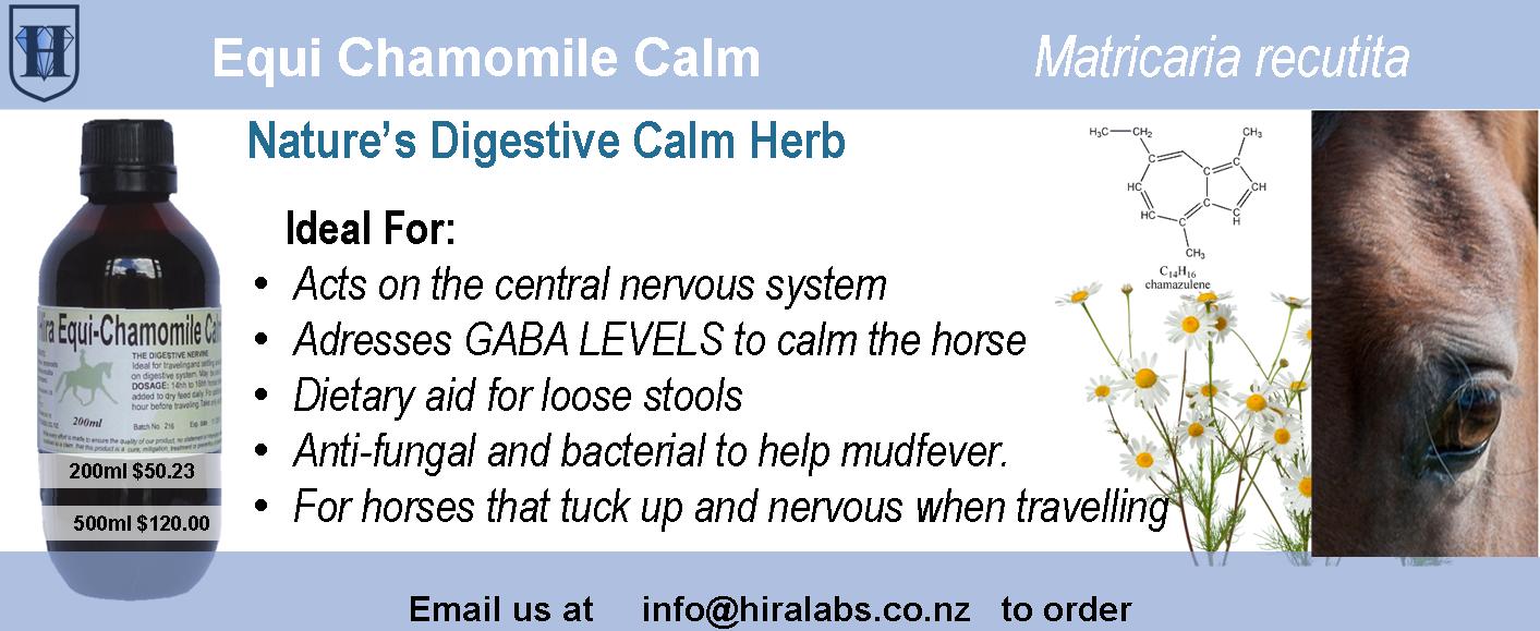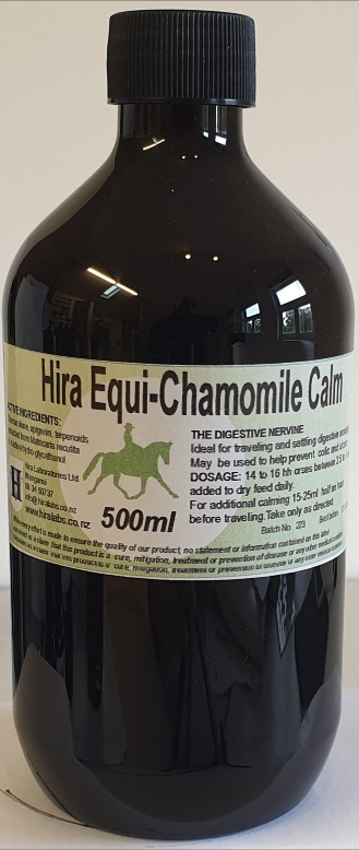 From organically grown Matricaria recutita flowers Mildly sedating particularly suitable for the digestive system.10-15ml an hour before the event. Ideal for horses that stress when travelling. Suitable for use with Hira Omega Oil Complex for minor skin conditions.